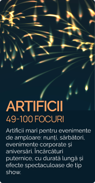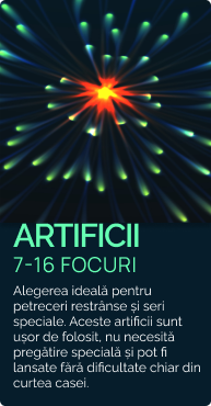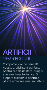 Artificiile noastre transformă orice eveniment în magie! Certificate, sigure și spectaculoase pentru toate gusturile și bugetele. Te ajutăm să alegi și livrăm rapid, tot ce rămâne e să le aprinzi!